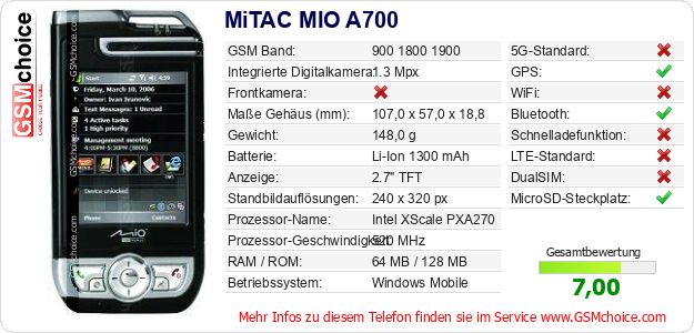 Daten des Mobiltelefons MiTAC MIO A700 auf Ihrer Seite