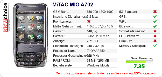 Hast du eigene Webseite? Willst du die Informationen über Standarddaten des Handys MiTAC MIO A702 irgendwo veröffentlichen? Das ist sehr einfach. Du kannst das Bild herunterladen oder kopieren und auf der Webseite folgenden Code hinzufügen:Das Einfügen von diesem Code verursacht das Anzeigen von dem folgenden Bild: