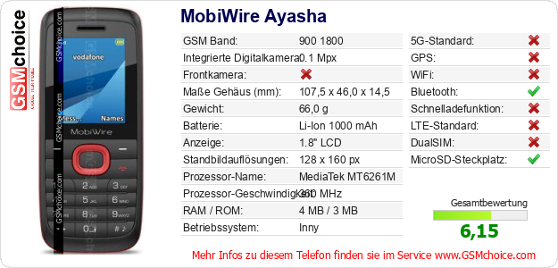 Hast du eigene Webseite? Willst du die Informationen über Standarddaten des Handys MobiWire Ayasha irgendwo veröffentlichen? Das ist sehr einfach. Du kannst das Bild herunterladen oder kopieren und auf der Webseite folgenden Code hinzufügen:Das Einfügen von diesem Code verursacht das Anzeigen von dem folgenden Bild: