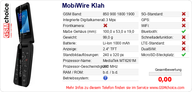 Hast du eigene Webseite? Willst du die Informationen über Standarddaten des Handys MobiWire Klah irgendwo veröffentlichen? Das ist sehr einfach. Du kannst das Bild herunterladen oder kopieren und auf der Webseite folgenden Code hinzufügen:Das Einfügen von diesem Code verursacht das Anzeigen von dem folgenden Bild: