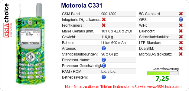 Hast du eigene Webseite? Willst du die Informationen über Standarddaten des Handys Motorola C331 irgendwo veröffentlichen? Das ist sehr einfach. Du kannst das Bild herunterladen oder kopieren und auf der Webseite folgenden Code hinzufügen:Das Einfügen von diesem Code verursacht das Anzeigen von dem folgenden Bild: