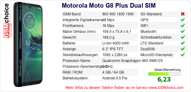 Hast du eigene Webseite? Willst du die Informationen über Standarddaten des Handys Motorola Moto G8 Plus Dual SIM irgendwo veröffentlichen? Das ist sehr einfach. Du kannst das Bild herunterladen oder kopieren und auf der Webseite folgenden Code hinzufügen:Das Einfügen von diesem Code verursacht das Anzeigen von dem folgenden Bild: