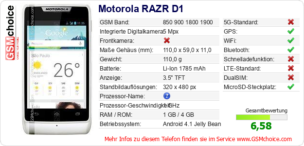 Hast du eigene Webseite? Willst du die Informationen über Standarddaten des Handys Motorola RAZR D1 irgendwo veröffentlichen? Das ist sehr einfach. Du kannst das Bild herunterladen oder kopieren und auf der Webseite folgenden Code hinzufügen:Das Einfügen von diesem Code verursacht das Anzeigen von dem folgenden Bild: