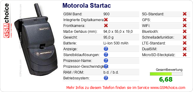 Hast du eigene Webseite? Willst du die Informationen über Standarddaten des Handys Motorola Startac irgendwo veröffentlichen? Das ist sehr einfach. Du kannst das Bild herunterladen oder kopieren und auf der Webseite folgenden Code hinzufügen:Das Einfügen von diesem Code verursacht das Anzeigen von dem folgenden Bild: