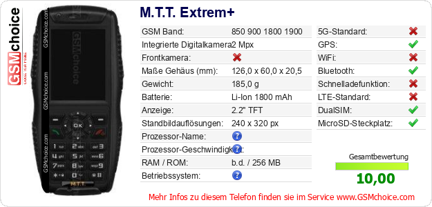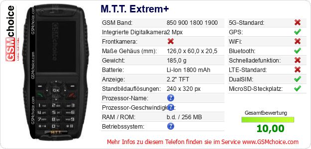 Hast du eigene Webseite? Willst du die Informationen über Standarddaten des Handys M.T.T. Extrem+ irgendwo veröffentlichen? Das ist sehr einfach. Du kannst das Bild herunterladen oder kopieren und auf der Webseite folgenden Code hinzufügen:Das Einfügen von diesem Code verursacht das Anzeigen von dem folgenden Bild: