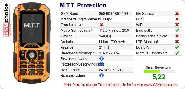 Hast du eigene Webseite? Willst du die Informationen über Standarddaten des Handys M.T.T. Protection irgendwo veröffentlichen? Das ist sehr einfach. Du kannst das Bild herunterladen oder kopieren und auf der Webseite folgenden Code hinzufügen:Das Einfügen von diesem Code verursacht das Anzeigen von dem folgenden Bild:
