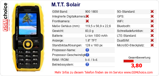 Hast du eigene Webseite? Willst du die Informationen über Standarddaten des Handys M.T.T. Solair irgendwo veröffentlichen? Das ist sehr einfach. Du kannst das Bild herunterladen oder kopieren und auf der Webseite folgenden Code hinzufügen:Das Einfügen von diesem Code verursacht das Anzeigen von dem folgenden Bild: