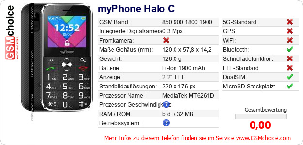 Hast du eigene Webseite? Willst du die Informationen über Standarddaten des Handys myPhone Halo C irgendwo veröffentlichen? Das ist sehr einfach. Du kannst das Bild herunterladen oder kopieren und auf der Webseite folgenden Code hinzufügen:Das Einfügen von diesem Code verursacht das Anzeigen von dem folgenden Bild: