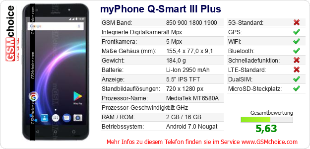 Hast du eigene Webseite? Willst du die Informationen über Standarddaten des Handys myPhone Q-Smart III Plus irgendwo veröffentlichen? Das ist sehr einfach. Du kannst das Bild herunterladen oder kopieren und auf der Webseite folgenden Code hinzufügen:Das Einfügen von diesem Code verursacht das Anzeigen von dem folgenden Bild: