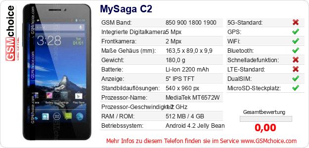 Hast du eigene Webseite? Willst du die Informationen über Standarddaten des Handys MySaga C2 irgendwo veröffentlichen? Das ist sehr einfach. Du kannst das Bild herunterladen oder kopieren und auf der Webseite folgenden Code hinzufügen:Das Einfügen von diesem Code verursacht das Anzeigen von dem folgenden Bild: