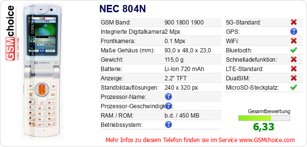 Hast du eigene Webseite? Willst du die Informationen über Standarddaten des Handys NEC 804N irgendwo veröffentlichen? Das ist sehr einfach. Du kannst das Bild herunterladen oder kopieren und auf der Webseite folgenden Code hinzufügen:Das Einfügen von diesem Code verursacht das Anzeigen von dem folgenden Bild: