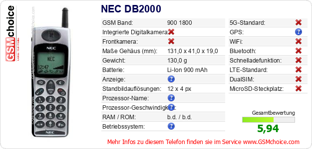 Hast du eigene Webseite? Willst du die Informationen über Standarddaten des Handys NEC DB2000 irgendwo veröffentlichen? Das ist sehr einfach. Du kannst das Bild herunterladen oder kopieren und auf der Webseite folgenden Code hinzufügen:Das Einfügen von diesem Code verursacht das Anzeigen von dem folgenden Bild: