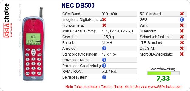 Hast du eigene Webseite? Willst du die Informationen über Standarddaten des Handys NEC DB500 irgendwo veröffentlichen? Das ist sehr einfach. Du kannst das Bild herunterladen oder kopieren und auf der Webseite folgenden Code hinzufügen:Das Einfügen von diesem Code verursacht das Anzeigen von dem folgenden Bild: