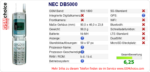 Hast du eigene Webseite? Willst du die Informationen über Standarddaten des Handys NEC DB5000 irgendwo veröffentlichen? Das ist sehr einfach. Du kannst das Bild herunterladen oder kopieren und auf der Webseite folgenden Code hinzufügen:Das Einfügen von diesem Code verursacht das Anzeigen von dem folgenden Bild: