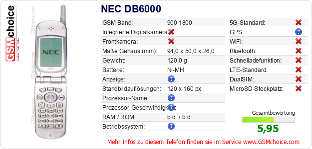 Hast du eigene Webseite? Willst du die Informationen über Standarddaten des Handys NEC DB6000 irgendwo veröffentlichen? Das ist sehr einfach. Du kannst das Bild herunterladen oder kopieren und auf der Webseite folgenden Code hinzufügen:Das Einfügen von diesem Code verursacht das Anzeigen von dem folgenden Bild: