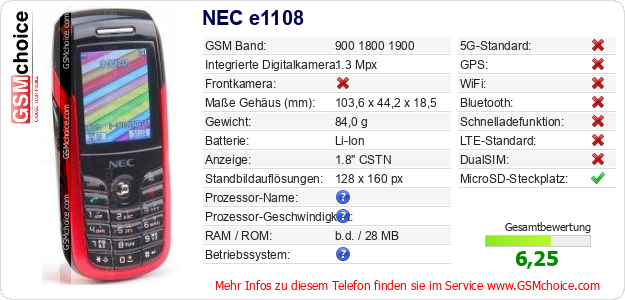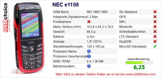 Hast du eigene Webseite? Willst du die Informationen über Standarddaten des Handys NEC e1108 irgendwo veröffentlichen? Das ist sehr einfach. Du kannst das Bild herunterladen oder kopieren und auf der Webseite folgenden Code hinzufügen:Das Einfügen von diesem Code verursacht das Anzeigen von dem folgenden Bild: