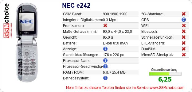 Hast du eigene Webseite? Willst du die Informationen über Standarddaten des Handys NEC e242 irgendwo veröffentlichen? Das ist sehr einfach. Du kannst das Bild herunterladen oder kopieren und auf der Webseite folgenden Code hinzufügen:Das Einfügen von diesem Code verursacht das Anzeigen von dem folgenden Bild: