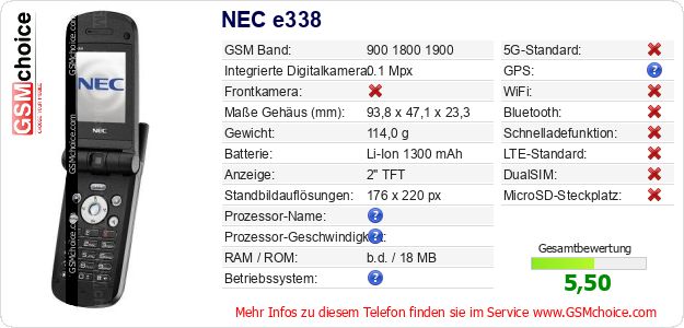 Hast du eigene Webseite? Willst du die Informationen über Standarddaten des Handys NEC e338 irgendwo veröffentlichen? Das ist sehr einfach. Du kannst das Bild herunterladen oder kopieren und auf der Webseite folgenden Code hinzufügen:Das Einfügen von diesem Code verursacht das Anzeigen von dem folgenden Bild: