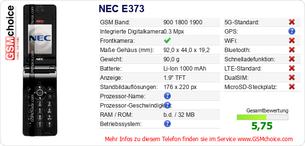 Hast du eigene Webseite? Willst du die Informationen über Standarddaten des Handys NEC E373 irgendwo veröffentlichen? Das ist sehr einfach. Du kannst das Bild herunterladen oder kopieren und auf der Webseite folgenden Code hinzufügen:Das Einfügen von diesem Code verursacht das Anzeigen von dem folgenden Bild: