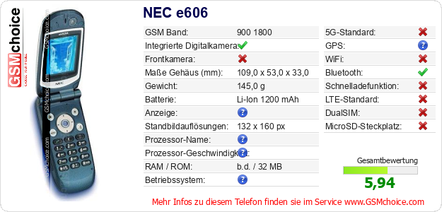 Hast du eigene Webseite? Willst du die Informationen über Standarddaten des Handys NEC e606 irgendwo veröffentlichen? Das ist sehr einfach. Du kannst das Bild herunterladen oder kopieren und auf der Webseite folgenden Code hinzufügen:Das Einfügen von diesem Code verursacht das Anzeigen von dem folgenden Bild: