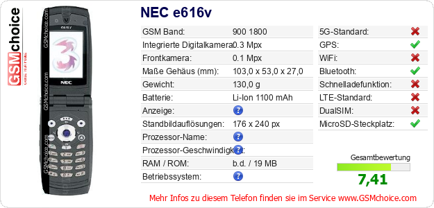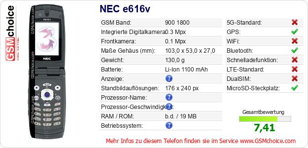 Hast du eigene Webseite? Willst du die Informationen über Standarddaten des Handys NEC e616v irgendwo veröffentlichen? Das ist sehr einfach. Du kannst das Bild herunterladen oder kopieren und auf der Webseite folgenden Code hinzufügen:Das Einfügen von diesem Code verursacht das Anzeigen von dem folgenden Bild: