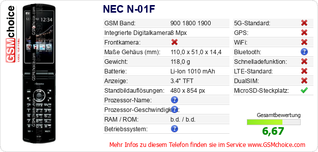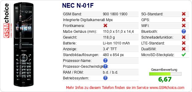 Hast du eigene Webseite? Willst du die Informationen über Standarddaten des Handys NEC N-01F irgendwo veröffentlichen? Das ist sehr einfach. Du kannst das Bild herunterladen oder kopieren und auf der Webseite folgenden Code hinzufügen:Das Einfügen von diesem Code verursacht das Anzeigen von dem folgenden Bild: