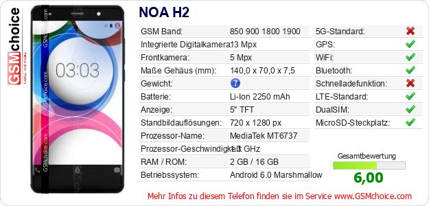 Hast du eigene Webseite? Willst du die Informationen über Standarddaten des Handys NOA H2 irgendwo veröffentlichen? Das ist sehr einfach. Du kannst das Bild herunterladen oder kopieren und auf der Webseite folgenden Code hinzufügen:Das Einfügen von diesem Code verursacht das Anzeigen von dem folgenden Bild: