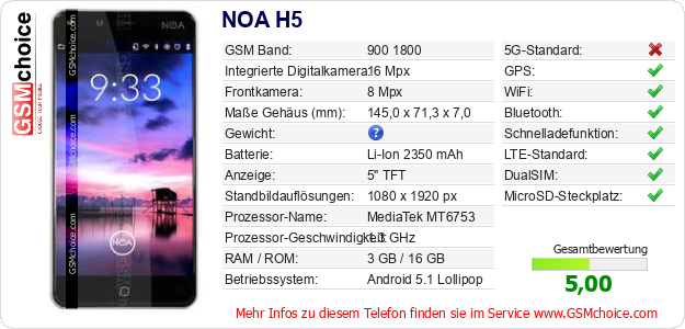 Hast du eigene Webseite? Willst du die Informationen über Standarddaten des Handys NOA H5 irgendwo veröffentlichen? Das ist sehr einfach. Du kannst das Bild herunterladen oder kopieren und auf der Webseite folgenden Code hinzufügen:Das Einfügen von diesem Code verursacht das Anzeigen von dem folgenden Bild:
