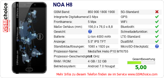Hast du eigene Webseite? Willst du die Informationen über Standarddaten des Handys NOA H8 irgendwo veröffentlichen? Das ist sehr einfach. Du kannst das Bild herunterladen oder kopieren und auf der Webseite folgenden Code hinzufügen:Das Einfügen von diesem Code verursacht das Anzeigen von dem folgenden Bild: