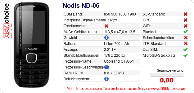 Hast du eigene Webseite? Willst du die Informationen über Standarddaten des Handys Nodis ND-06 irgendwo veröffentlichen? Das ist sehr einfach. Du kannst das Bild herunterladen oder kopieren und auf der Webseite folgenden Code hinzufügen:Das Einfügen von diesem Code verursacht das Anzeigen von dem folgenden Bild: