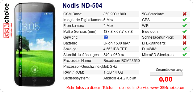 Hast du eigene Webseite? Willst du die Informationen über Standarddaten des Handys Nodis ND-504 irgendwo veröffentlichen? Das ist sehr einfach. Du kannst das Bild herunterladen oder kopieren und auf der Webseite folgenden Code hinzufügen:Das Einfügen von diesem Code verursacht das Anzeigen von dem folgenden Bild: