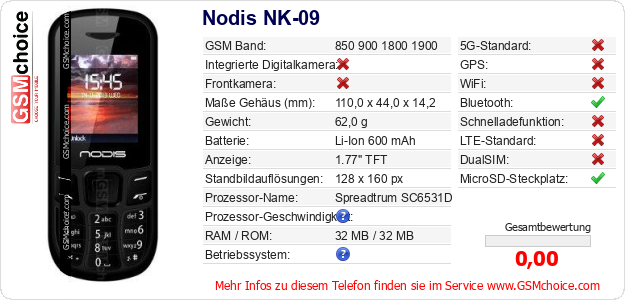 Hast du eigene Webseite? Willst du die Informationen über Standarddaten des Handys Nodis NK-09 irgendwo veröffentlichen? Das ist sehr einfach. Du kannst das Bild herunterladen oder kopieren und auf der Webseite folgenden Code hinzufügen:Das Einfügen von diesem Code verursacht das Anzeigen von dem folgenden Bild: