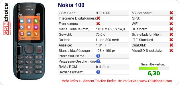 Hast du eigene Webseite? Willst du die Informationen über Standarddaten des Handys Nokia 100 irgendwo veröffentlichen? Das ist sehr einfach. Du kannst das Bild herunterladen oder kopieren und auf der Webseite folgenden Code hinzufügen:Das Einfügen von diesem Code verursacht das Anzeigen von dem folgenden Bild: