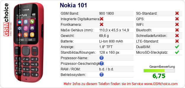 Hast du eigene Webseite? Willst du die Informationen über Standarddaten des Handys Nokia 101 irgendwo veröffentlichen? Das ist sehr einfach. Du kannst das Bild herunterladen oder kopieren und auf der Webseite folgenden Code hinzufügen:Das Einfügen von diesem Code verursacht das Anzeigen von dem folgenden Bild:
