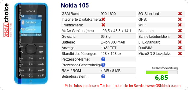 Hast du eigene Webseite? Willst du die Informationen über Standarddaten des Handys Nokia 105 irgendwo veröffentlichen? Das ist sehr einfach. Du kannst das Bild herunterladen oder kopieren und auf der Webseite folgenden Code hinzufügen:Das Einfügen von diesem Code verursacht das Anzeigen von dem folgenden Bild: