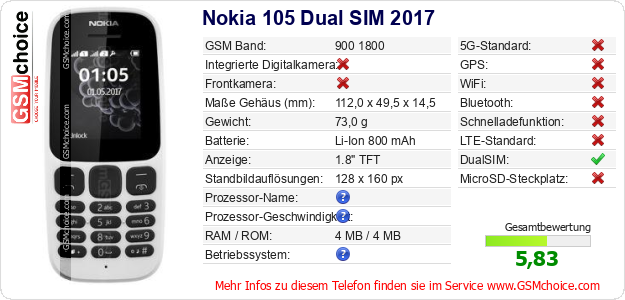 Daten des Mobiltelefons Nokia 105 Dual SIM 2017 auf Ihrer Seite