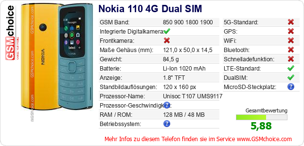 Hast du eigene Webseite? Willst du die Informationen über Standarddaten des Handys Nokia 110 4G Dual SIM irgendwo veröffentlichen? Das ist sehr einfach. Du kannst das Bild herunterladen oder kopieren und auf der Webseite folgenden Code hinzufügen:Das Einfügen von diesem Code verursacht das Anzeigen von dem folgenden Bild:
