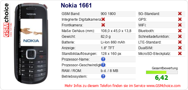 Hast du eigene Webseite? Willst du die Informationen über Standarddaten des Handys Nokia 1661 irgendwo veröffentlichen? Das ist sehr einfach. Du kannst das Bild herunterladen oder kopieren und auf der Webseite folgenden Code hinzufügen:Das Einfügen von diesem Code verursacht das Anzeigen von dem folgenden Bild: