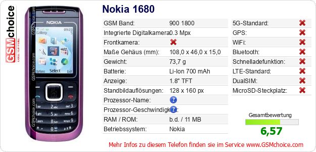 Hast du eigene Webseite? Willst du die Informationen über Standarddaten des Handys Nokia 1680 irgendwo veröffentlichen? Das ist sehr einfach. Du kannst das Bild herunterladen oder kopieren und auf der Webseite folgenden Code hinzufügen:Das Einfügen von diesem Code verursacht das Anzeigen von dem folgenden Bild: