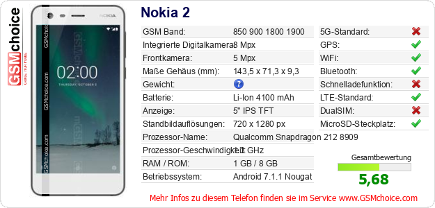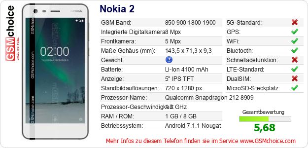 Hast du eigene Webseite? Willst du die Informationen über Standarddaten des Handys Nokia 2 irgendwo veröffentlichen? Das ist sehr einfach. Du kannst das Bild herunterladen oder kopieren und auf der Webseite folgenden Code hinzufügen:Das Einfügen von diesem Code verursacht das Anzeigen von dem folgenden Bild: