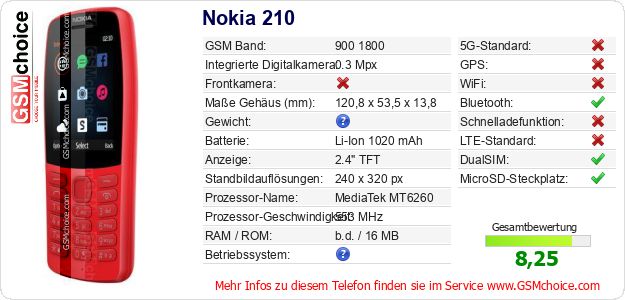 Hast du eigene Webseite? Willst du die Informationen über Standarddaten des Handys Nokia 210 irgendwo veröffentlichen? Das ist sehr einfach. Du kannst das Bild herunterladen oder kopieren und auf der Webseite folgenden Code hinzufügen:Das Einfügen von diesem Code verursacht das Anzeigen von dem folgenden Bild: