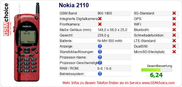 Hast du eigene Webseite? Willst du die Informationen über Standarddaten des Handys Nokia 2110 irgendwo veröffentlichen? Das ist sehr einfach. Du kannst das Bild herunterladen oder kopieren und auf der Webseite folgenden Code hinzufügen:Das Einfügen von diesem Code verursacht das Anzeigen von dem folgenden Bild: