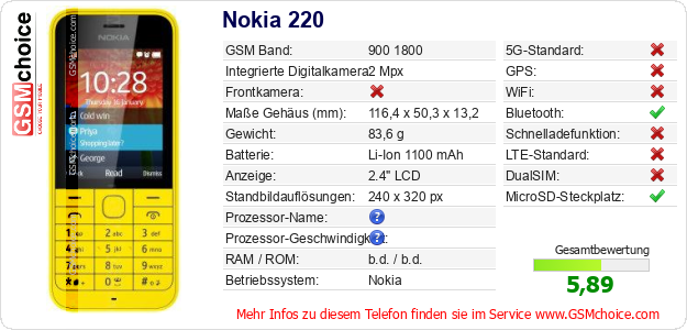 Hast du eigene Webseite? Willst du die Informationen über Standarddaten des Handys Nokia 220 irgendwo veröffentlichen? Das ist sehr einfach. Du kannst das Bild herunterladen oder kopieren und auf der Webseite folgenden Code hinzufügen:Das Einfügen von diesem Code verursacht das Anzeigen von dem folgenden Bild: