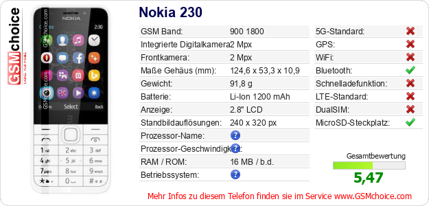 Hast du eigene Webseite? Willst du die Informationen über Standarddaten des Handys Nokia 230 irgendwo veröffentlichen? Das ist sehr einfach. Du kannst das Bild herunterladen oder kopieren und auf der Webseite folgenden Code hinzufügen:Das Einfügen von diesem Code verursacht das Anzeigen von dem folgenden Bild: