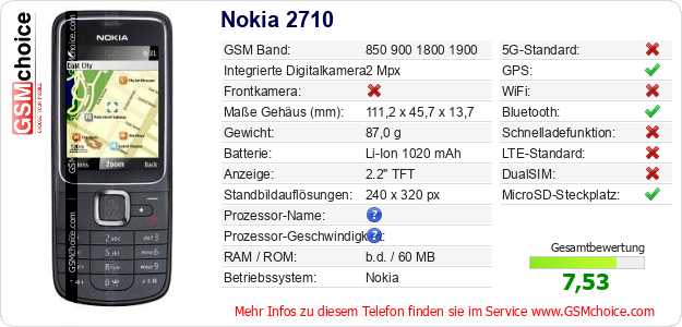 Hast du eigene Webseite? Willst du die Informationen über Standarddaten des Handys Nokia 2710 irgendwo veröffentlichen? Das ist sehr einfach. Du kannst das Bild herunterladen oder kopieren und auf der Webseite folgenden Code hinzufügen:Das Einfügen von diesem Code verursacht das Anzeigen von dem folgenden Bild: