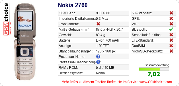 Hast du eigene Webseite? Willst du die Informationen über Standarddaten des Handys Nokia 2760 irgendwo veröffentlichen? Das ist sehr einfach. Du kannst das Bild herunterladen oder kopieren und auf der Webseite folgenden Code hinzufügen:Das Einfügen von diesem Code verursacht das Anzeigen von dem folgenden Bild: