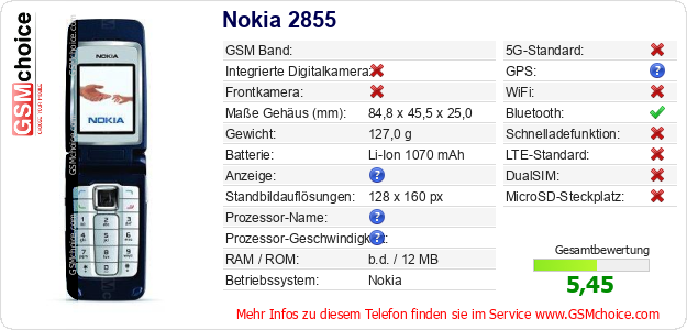Hast du eigene Webseite? Willst du die Informationen über Standarddaten des Handys Nokia 2855 irgendwo veröffentlichen? Das ist sehr einfach. Du kannst das Bild herunterladen oder kopieren und auf der Webseite folgenden Code hinzufügen:Das Einfügen von diesem Code verursacht das Anzeigen von dem folgenden Bild: