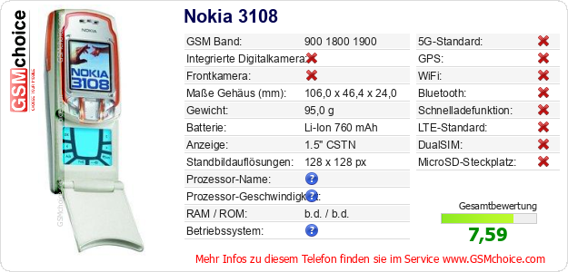 Hast du eigene Webseite? Willst du die Informationen über Standarddaten des Handys Nokia 3108 irgendwo veröffentlichen? Das ist sehr einfach. Du kannst das Bild herunterladen oder kopieren und auf der Webseite folgenden Code hinzufügen:Das Einfügen von diesem Code verursacht das Anzeigen von dem folgenden Bild: