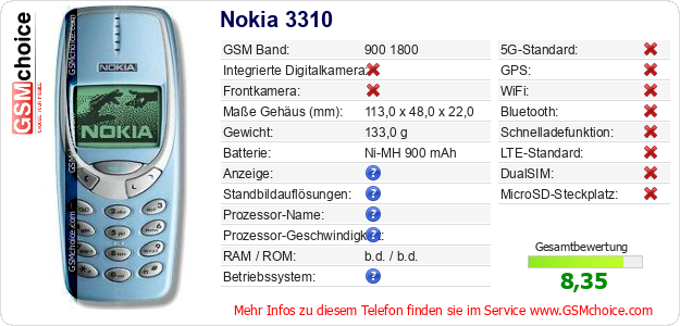 Hast du eigene Webseite? Willst du die Informationen über Standarddaten des Handys Nokia 3310 irgendwo veröffentlichen? Das ist sehr einfach. Du kannst das Bild herunterladen oder kopieren und auf der Webseite folgenden Code hinzufügen:Das Einfügen von diesem Code verursacht das Anzeigen von dem folgenden Bild: