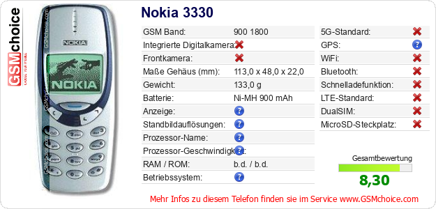Hast du eigene Webseite? Willst du die Informationen über Standarddaten des Handys Nokia 3330 irgendwo veröffentlichen? Das ist sehr einfach. Du kannst das Bild herunterladen oder kopieren und auf der Webseite folgenden Code hinzufügen:Das Einfügen von diesem Code verursacht das Anzeigen von dem folgenden Bild: